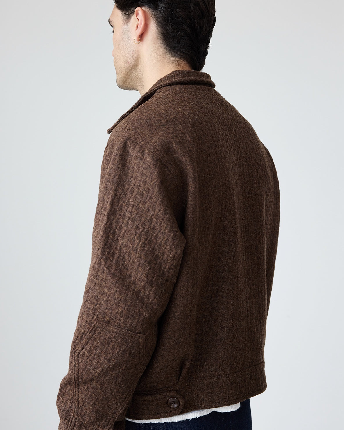 Our new, cropped gas jacket inspired by classic 1950’s silhouettes. The jacket is a cut out of a textured 100% wool with a full rayon lining and faux-horn buttons. This jacket sits right above the waist and sports a two-way zipper and panels at either cuff.