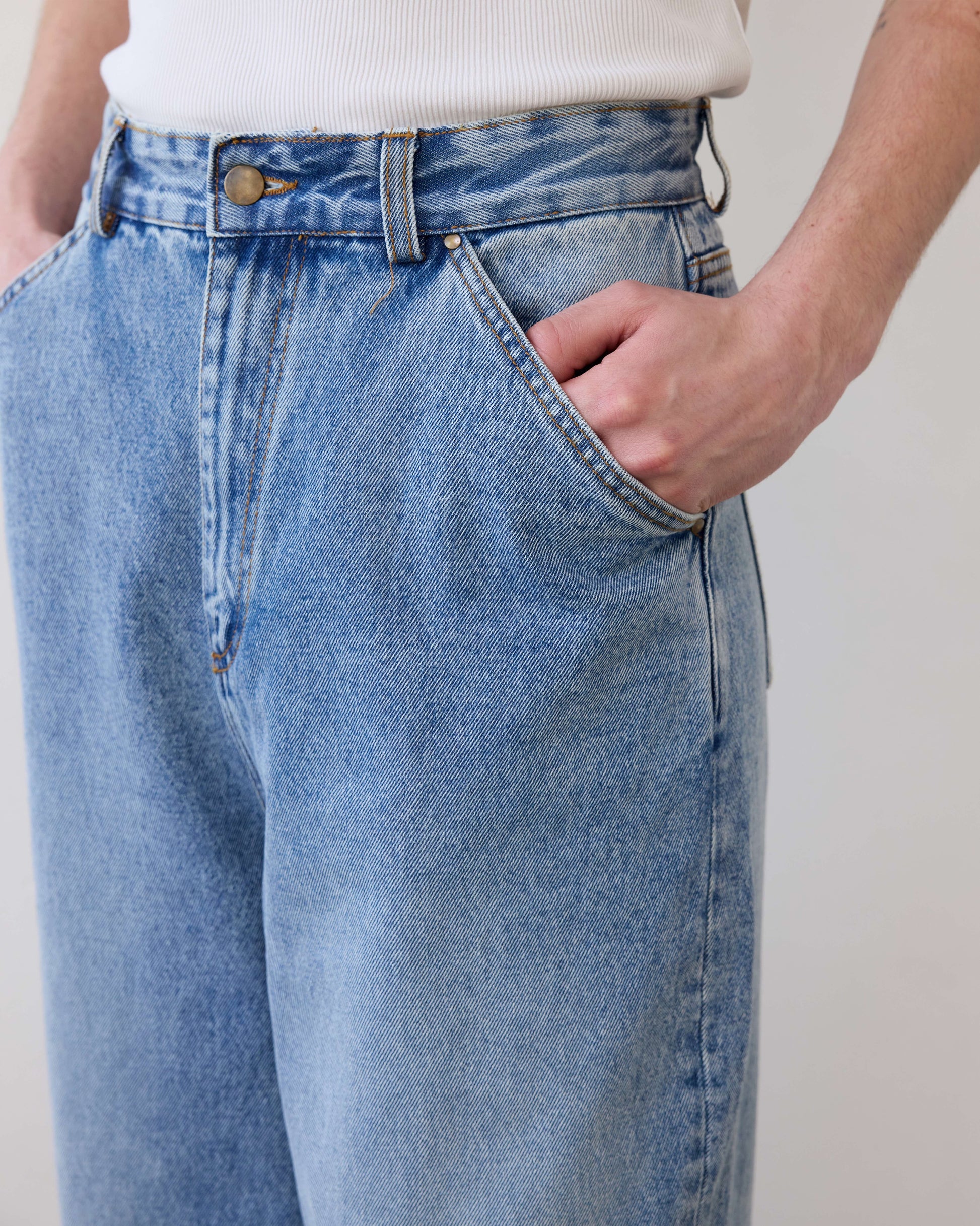 Our signature bottoms feature a wide, straight-leg silhouette with a mid-rise. Slant pockets at the hips and two back pockets complete the classic design. They are made of a vintage-washed 100% cotton denim.
