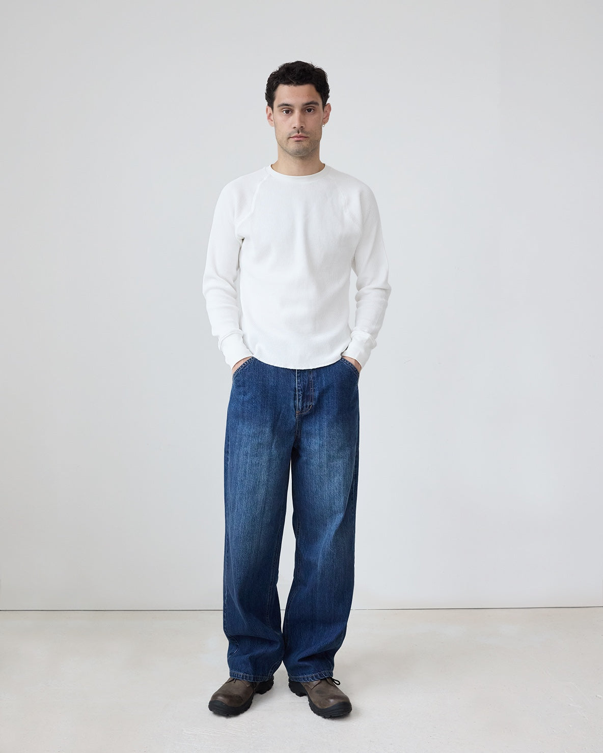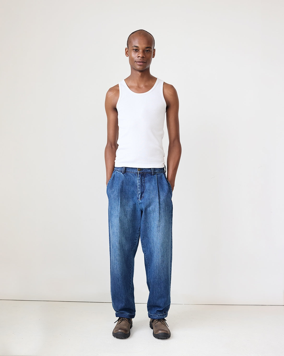 A classic trouser shape with a full hip and a taper toward the hem. Cut in a vintage washed, 14 oz denim, these trousers have double pleats, on seam pockets, faux horn hardware and a cuff at the hem.