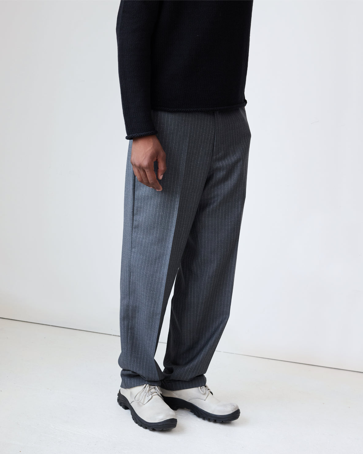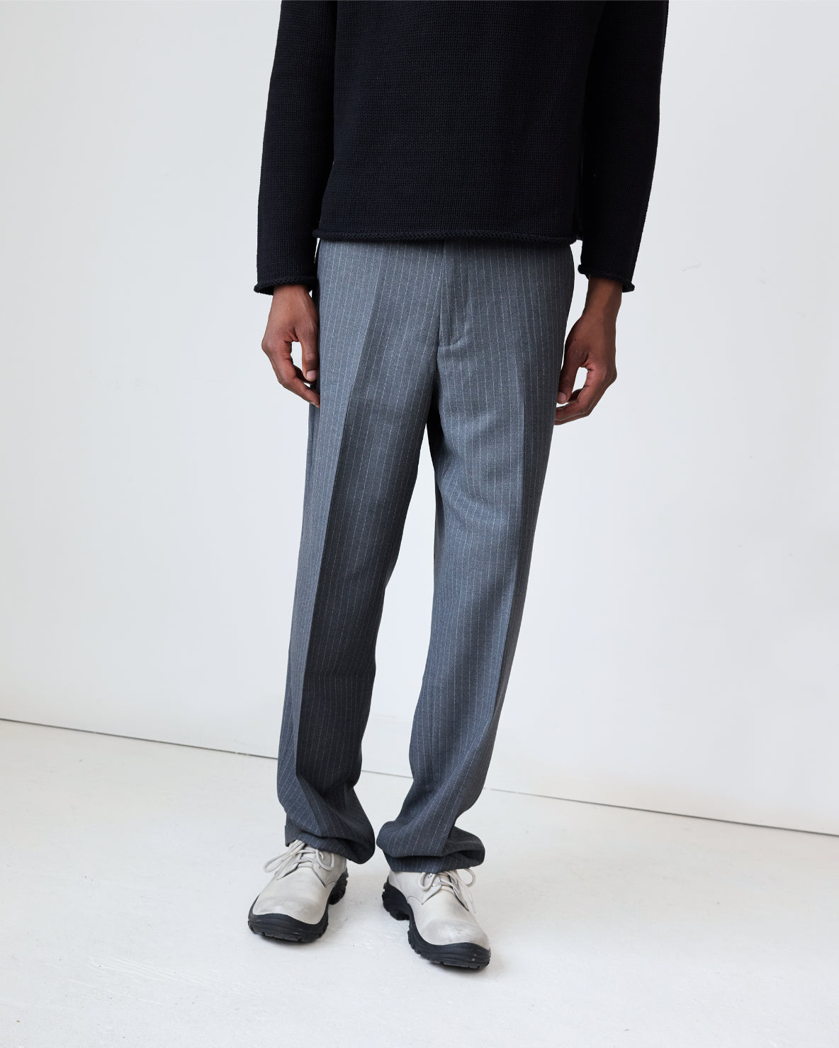 Our Flat Front Trouser is a classic style with a relaxed fit. Cut in a deadstock, 100% wool boucle pinstripe, these trousers have a center crease, on seam pockets, a hidden coin pocket and faux horn hardware. These trousers have a high waist and are true to size. Size up for a relaxed fit.