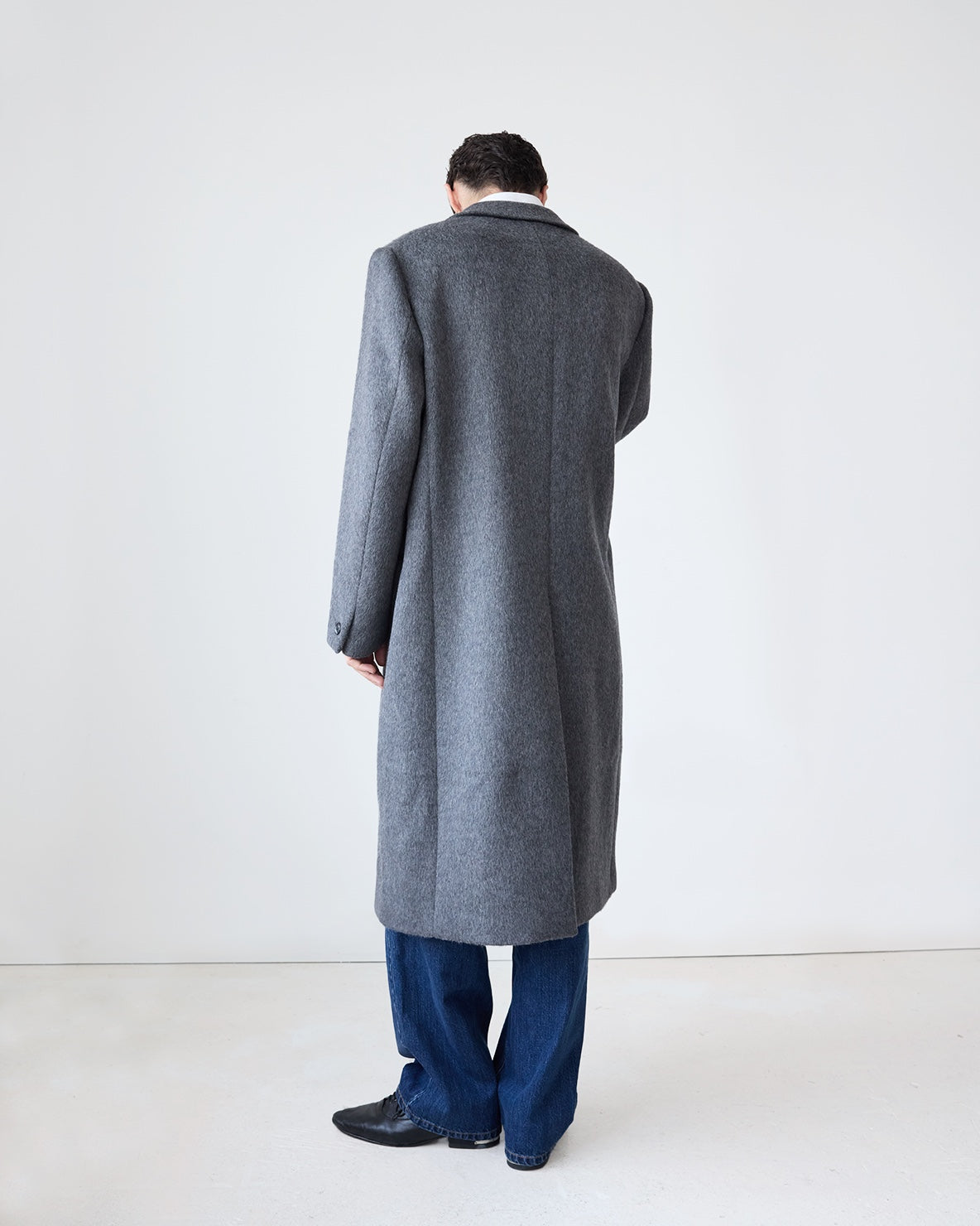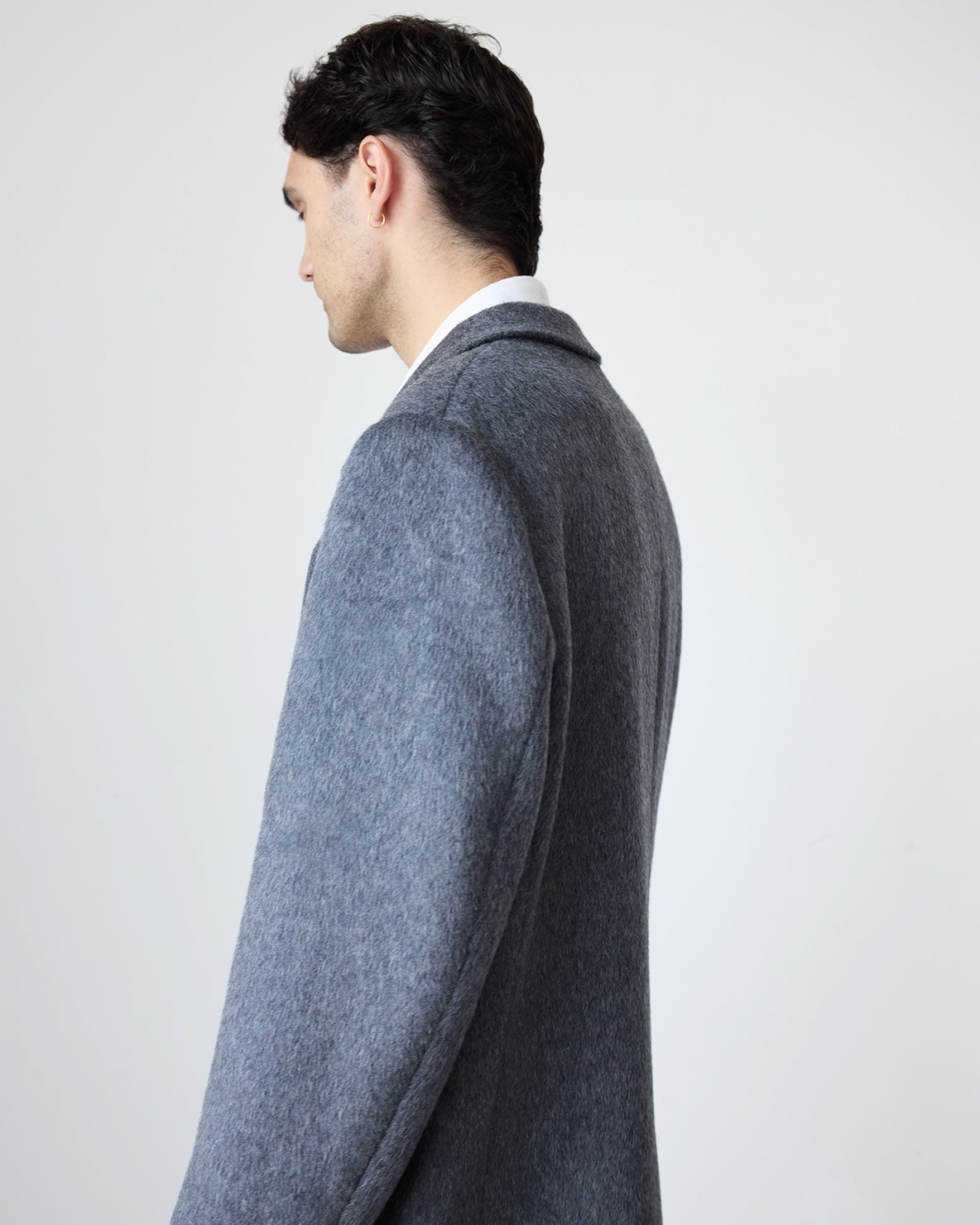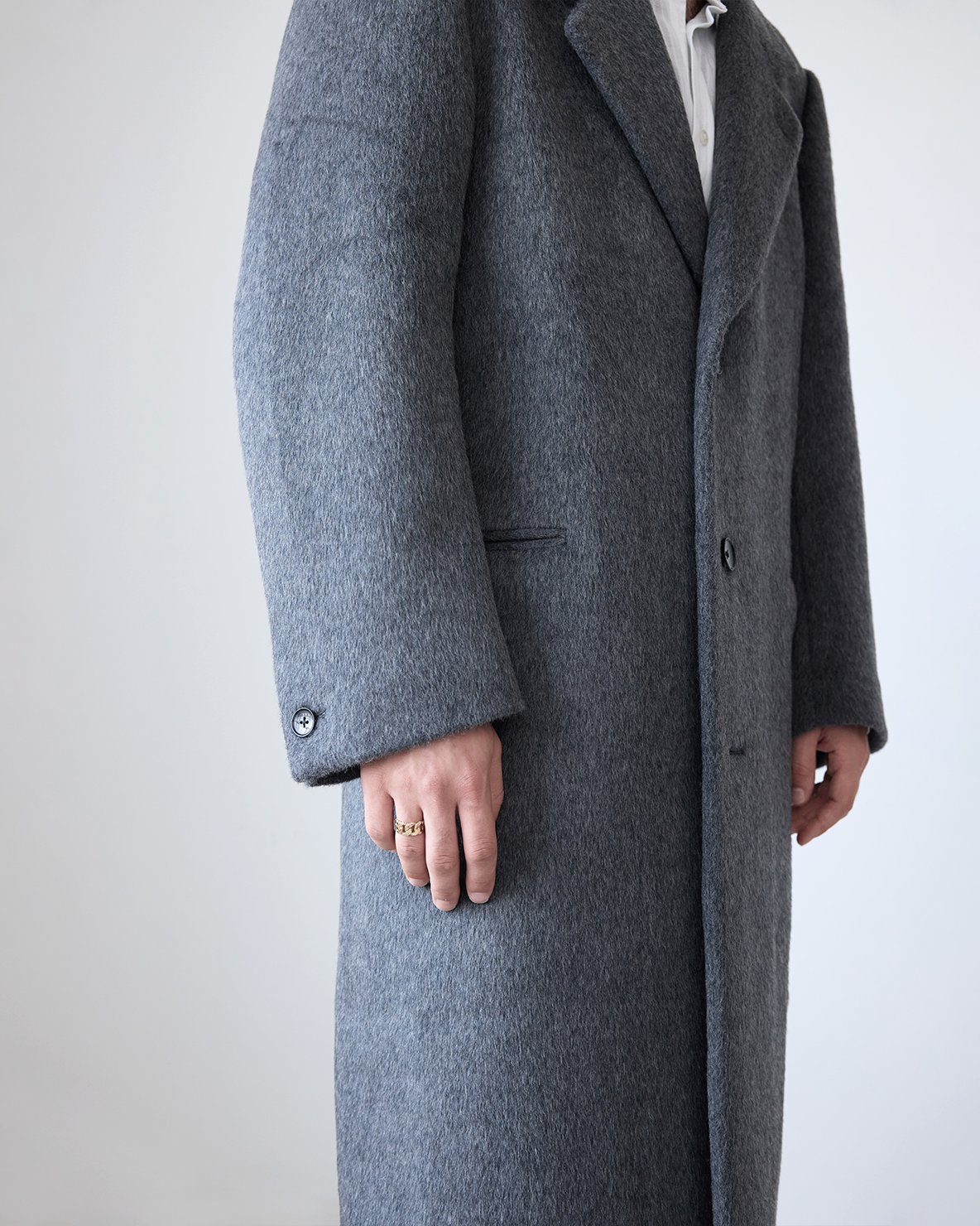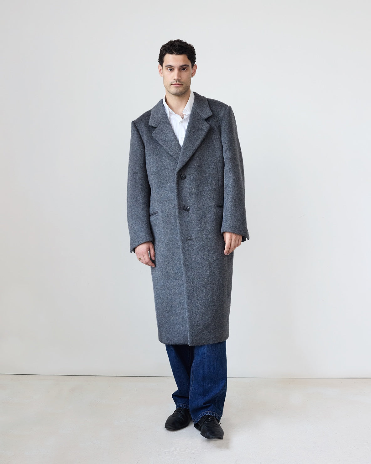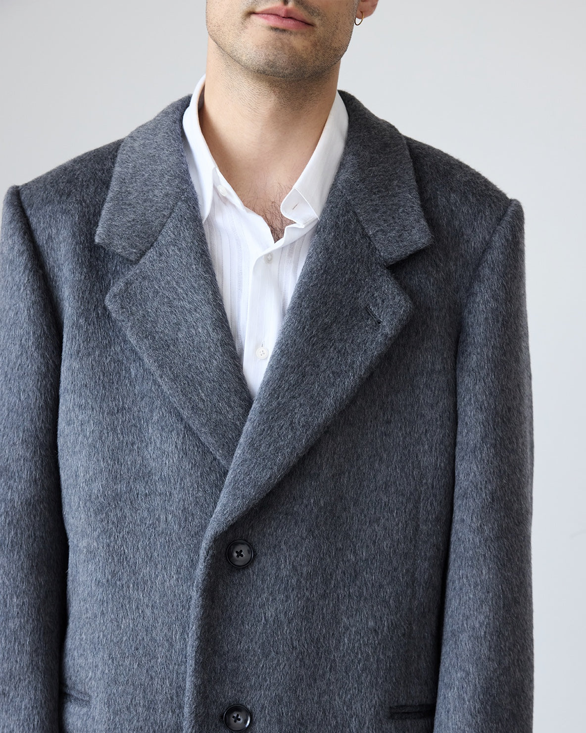 Our Hewitt Coat is made of a hairy 100% wool material. The coat has padded shoulders and a canvassed body, creating a wide, oversized silhouette. It has functional welt pockets, an interior breast pocket and contrast faux-horn buttons. Fully lined.