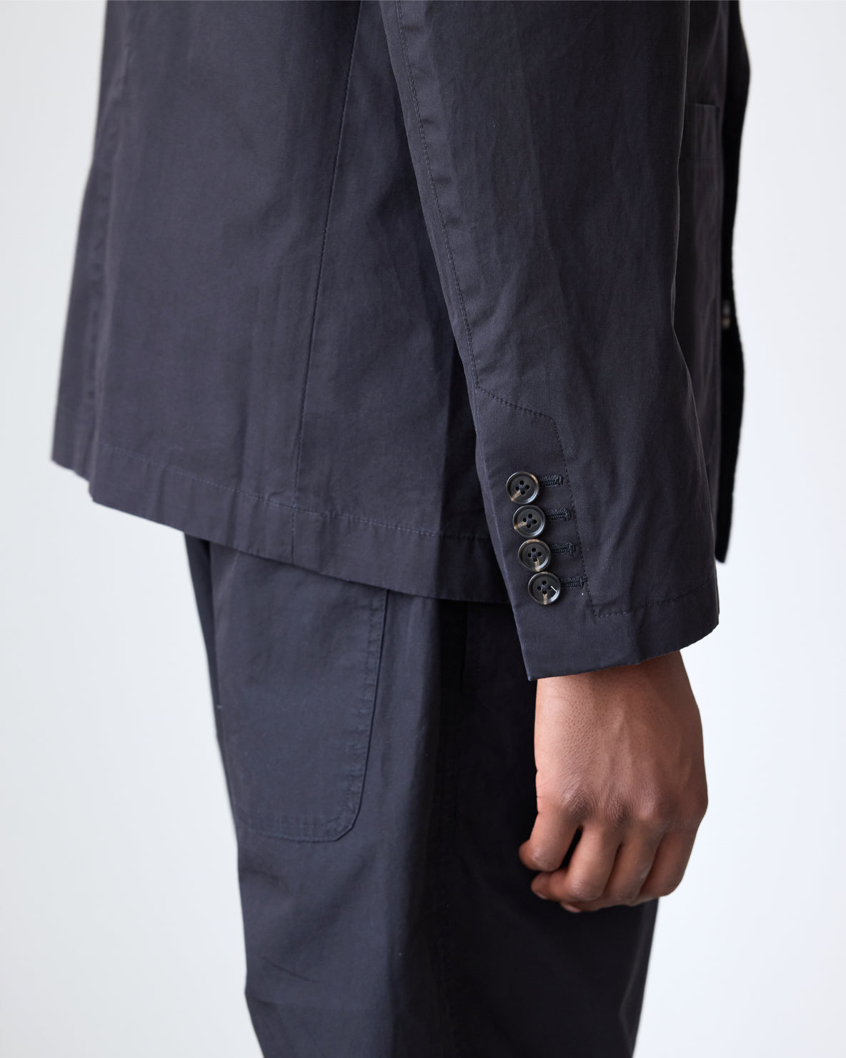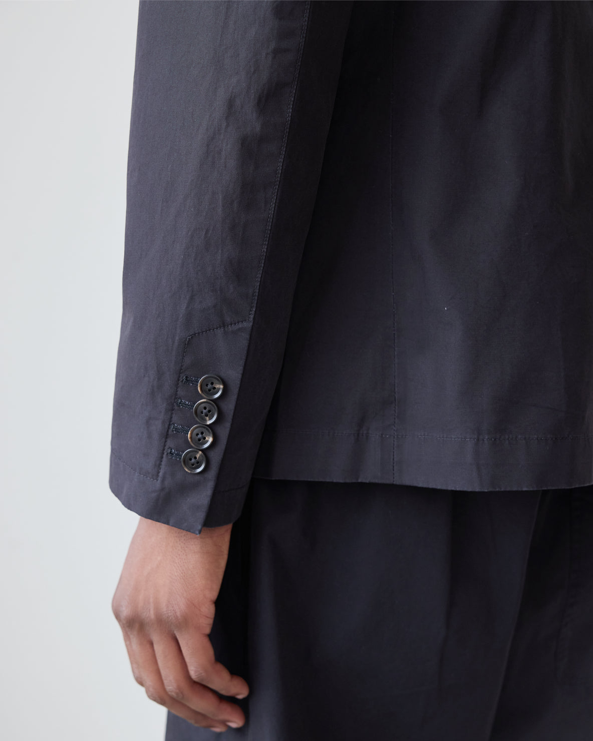 Our new double breasted blazer in a coated 100% cotton poplin. This jacket has an unstructured shoulder and a wide, boxy fit. It has functional patch pockets, an interior breast pocket and tonal faux-horn buttons. Online with taped seam finish.