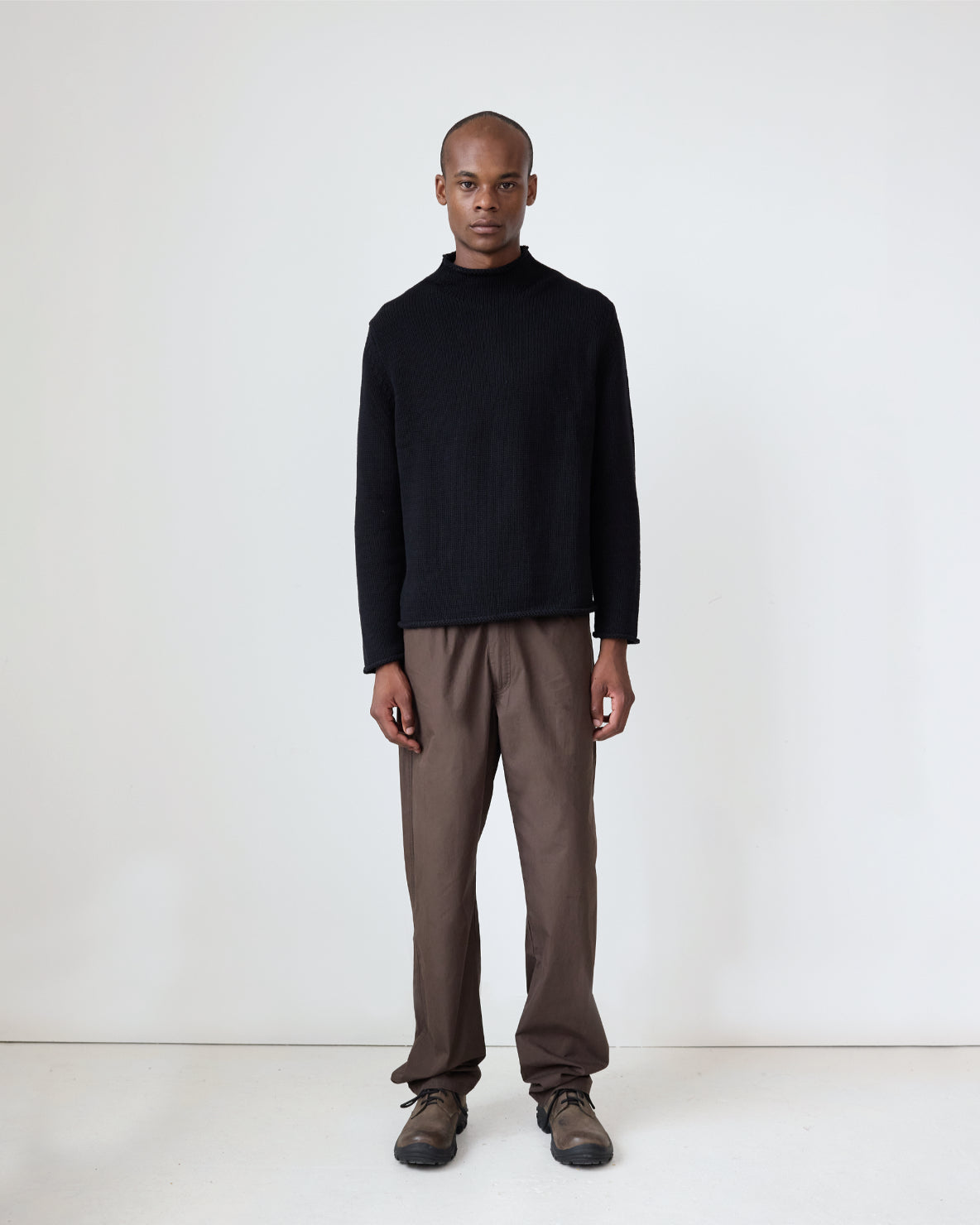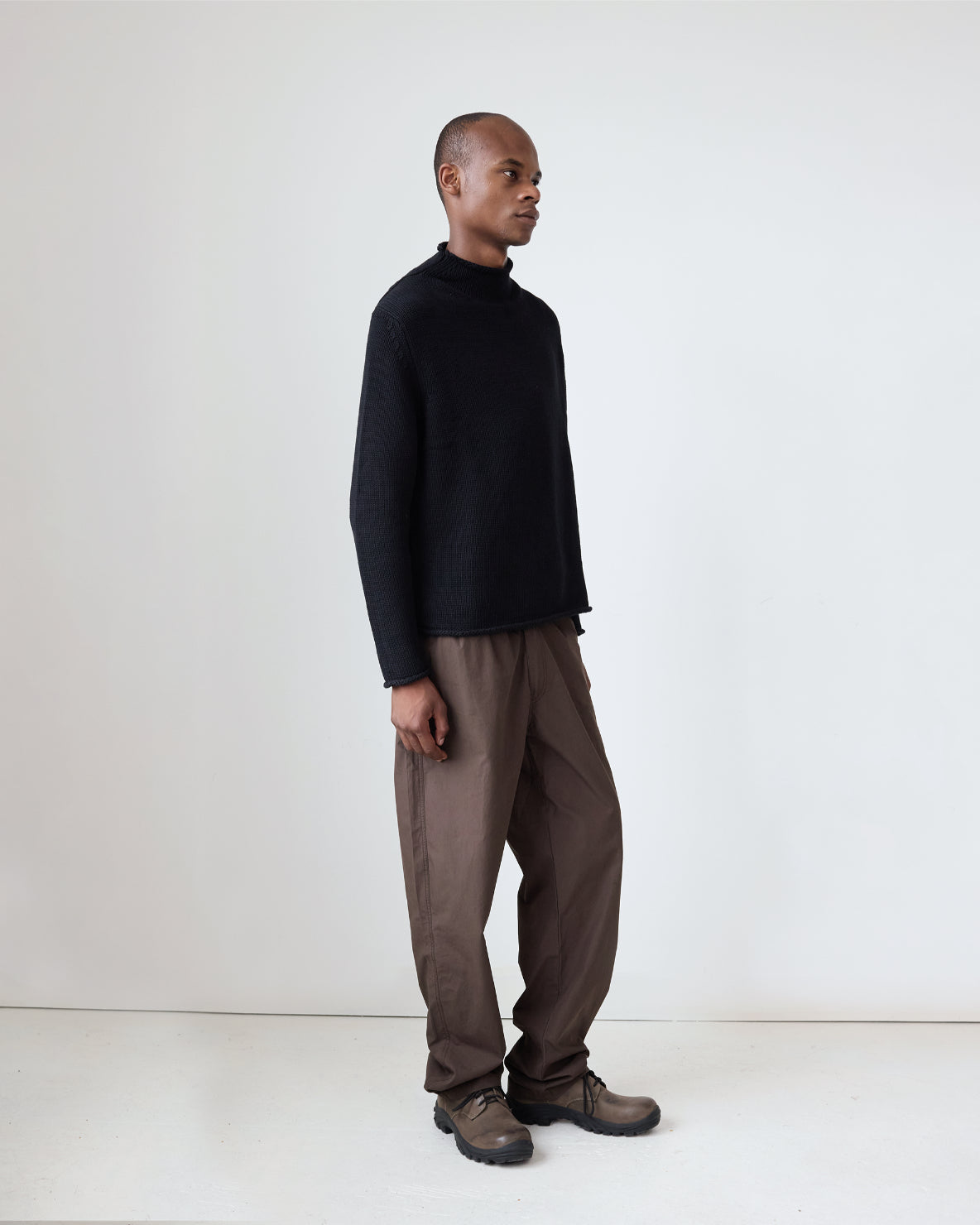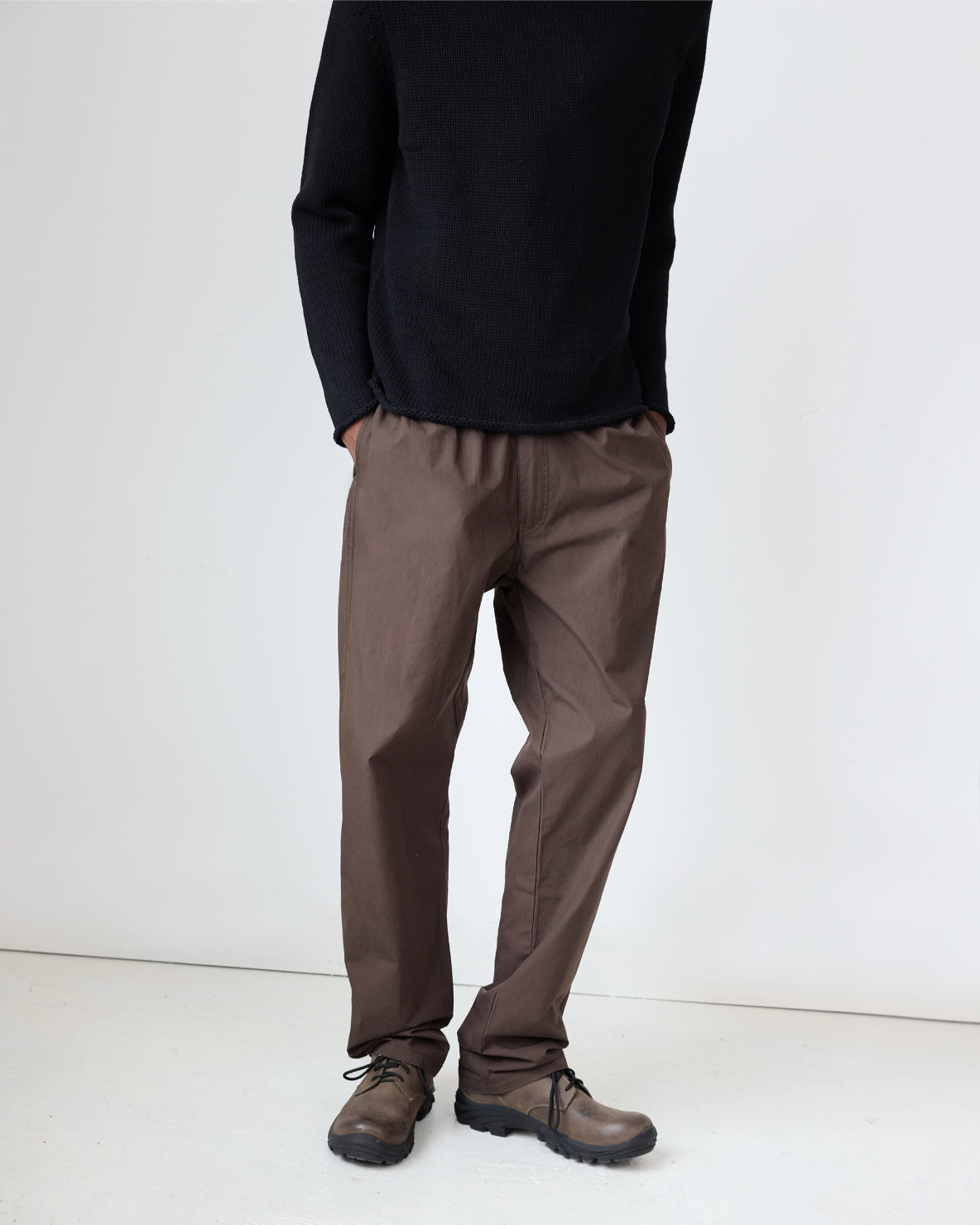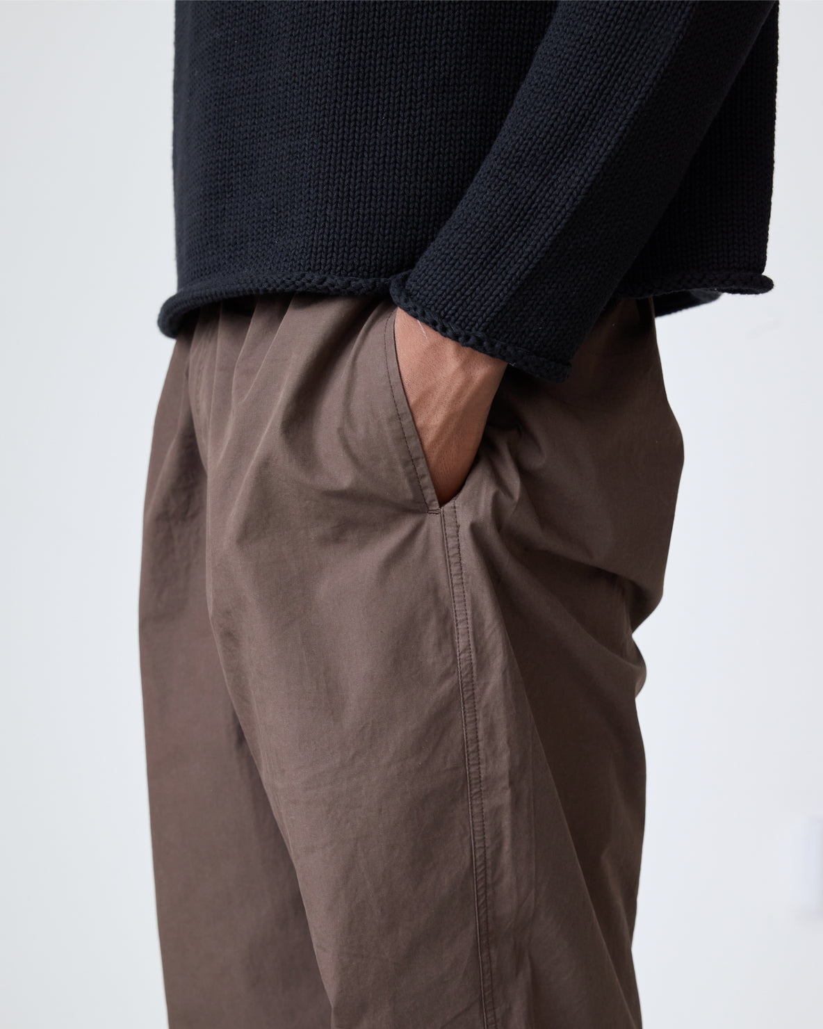 The Marine Trouser is a new silhouette with a straight-cut leg and elasticated waistband. Cut from a coated 100% cotton poplin, these trousers are lightweight with an easy drape. They feature on seam pockets, a functional fly and a back patch pocket.