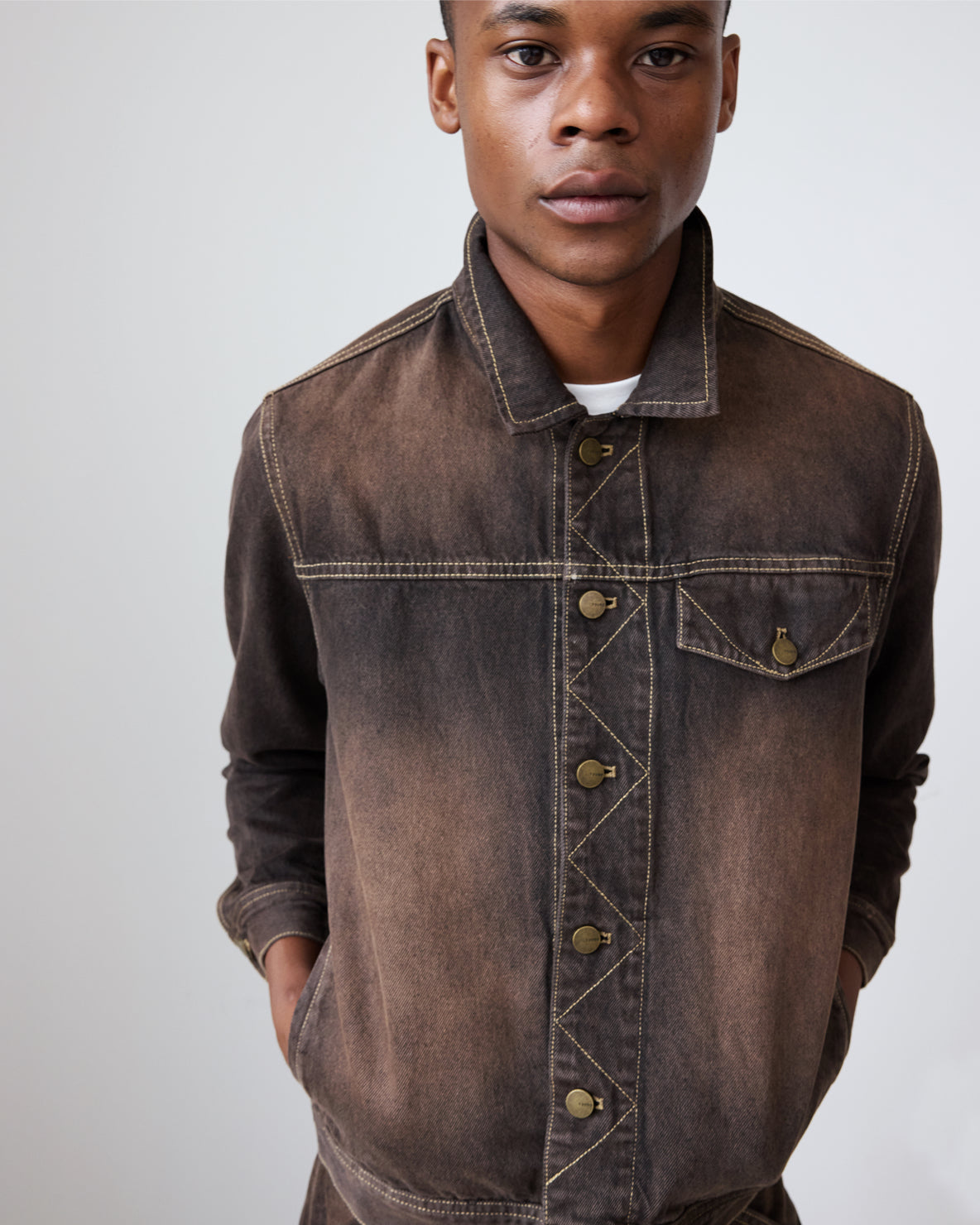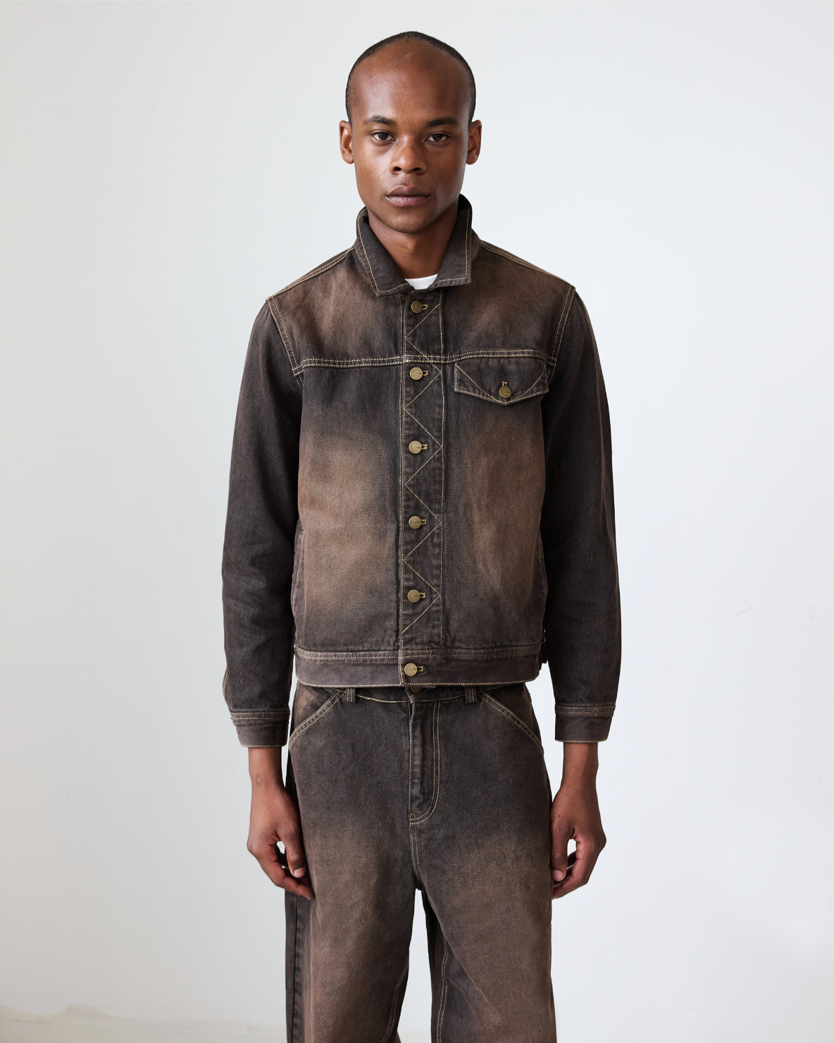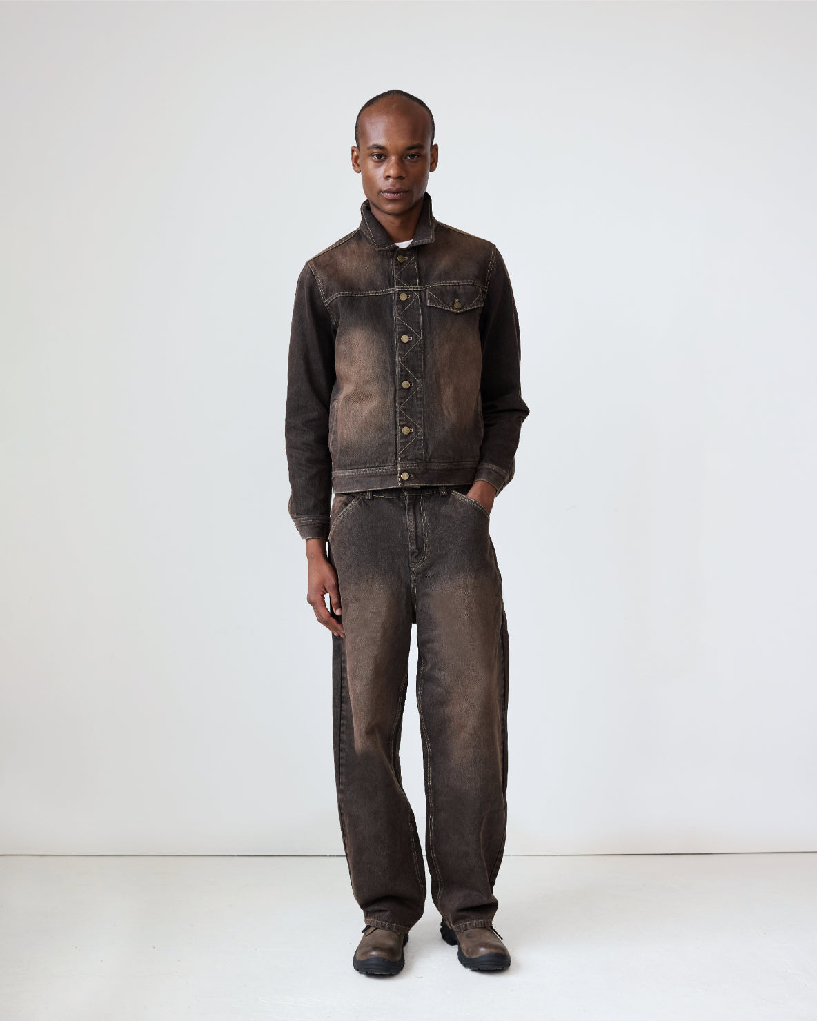 Our signature take on a menswear staple, the Arch denim jacket is made out of 100% cotton 14oz denim with a vintage wash and a brown color overdye . Cut with a wide, boxy fit, the jacket has a left chest pocket, two hip pockets and antique brass logo shanks. This jacket runs small.