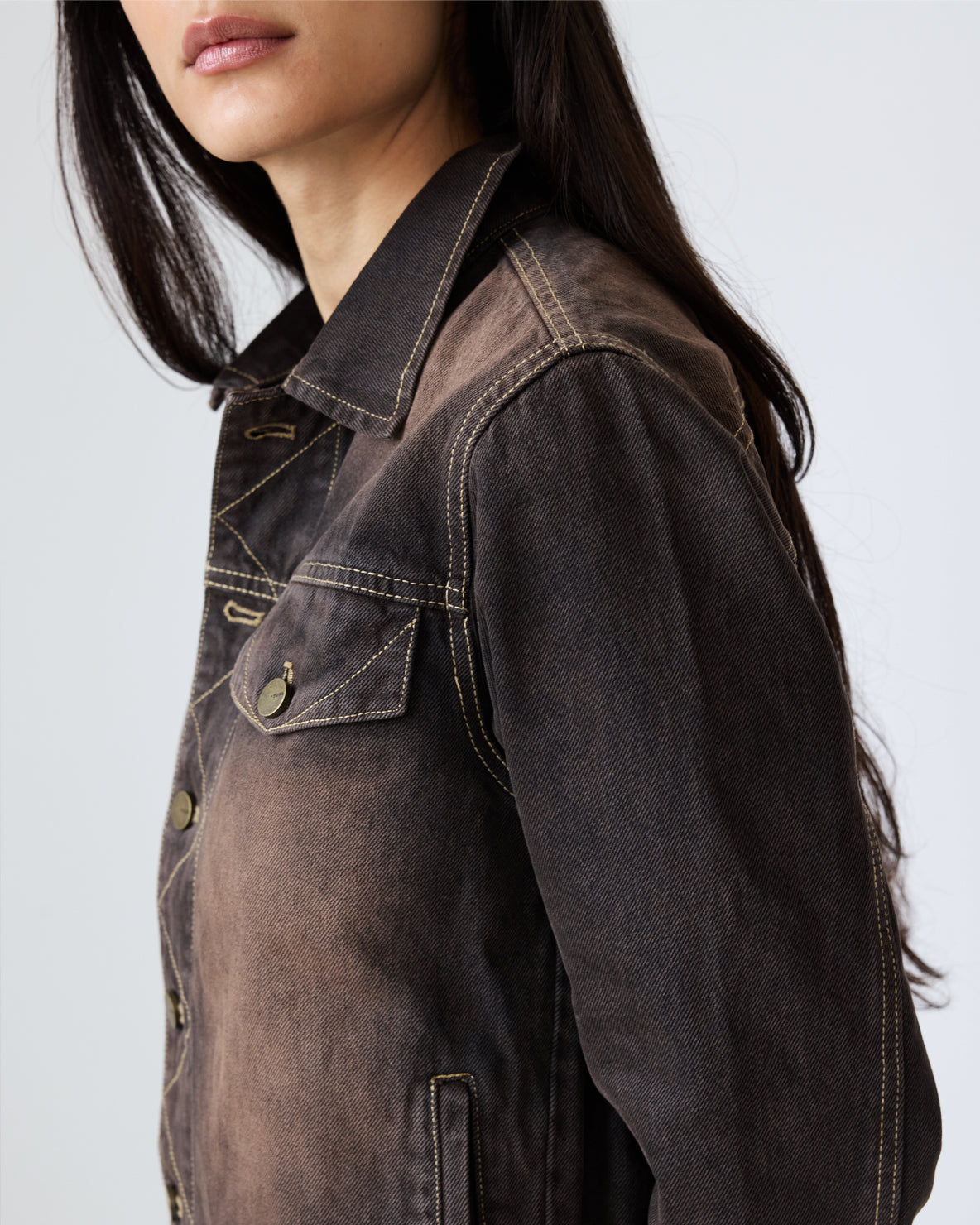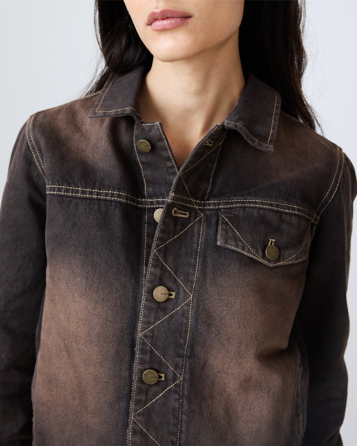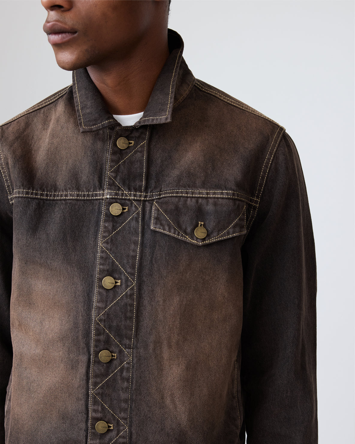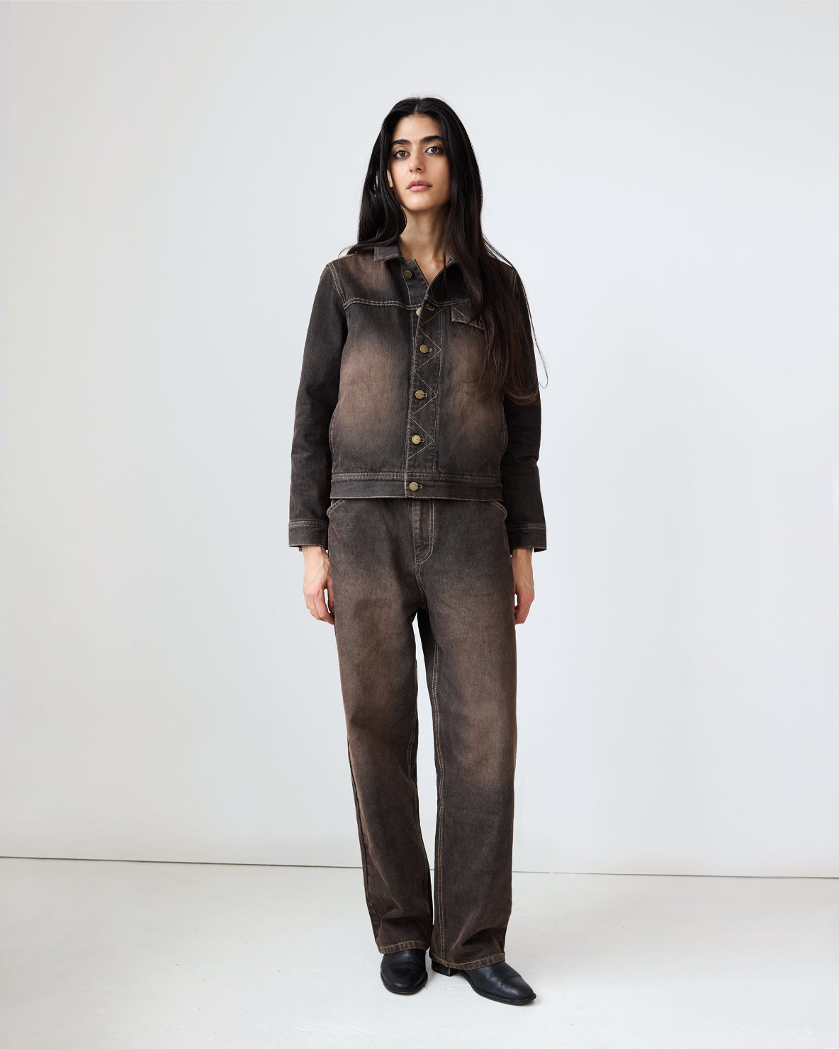 Our signature take on a menswear staple, the Arch denim jacket is made out of 100% cotton 14oz denim with a vintage wash and a brown color overdye . Cut with a wide, boxy fit, the jacket has a left chest pocket, two hip pockets and antique brass logo shanks. This jacket runs small.