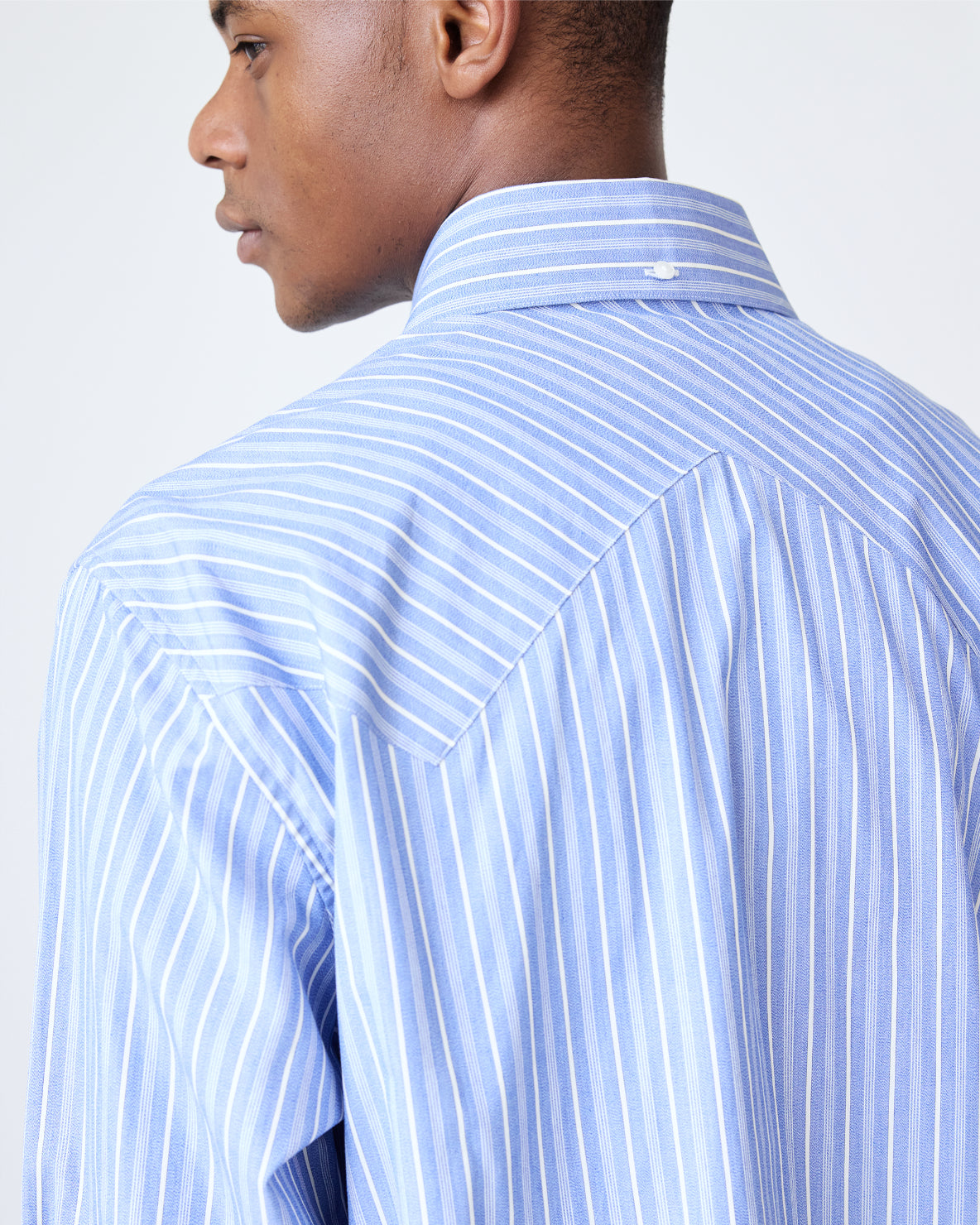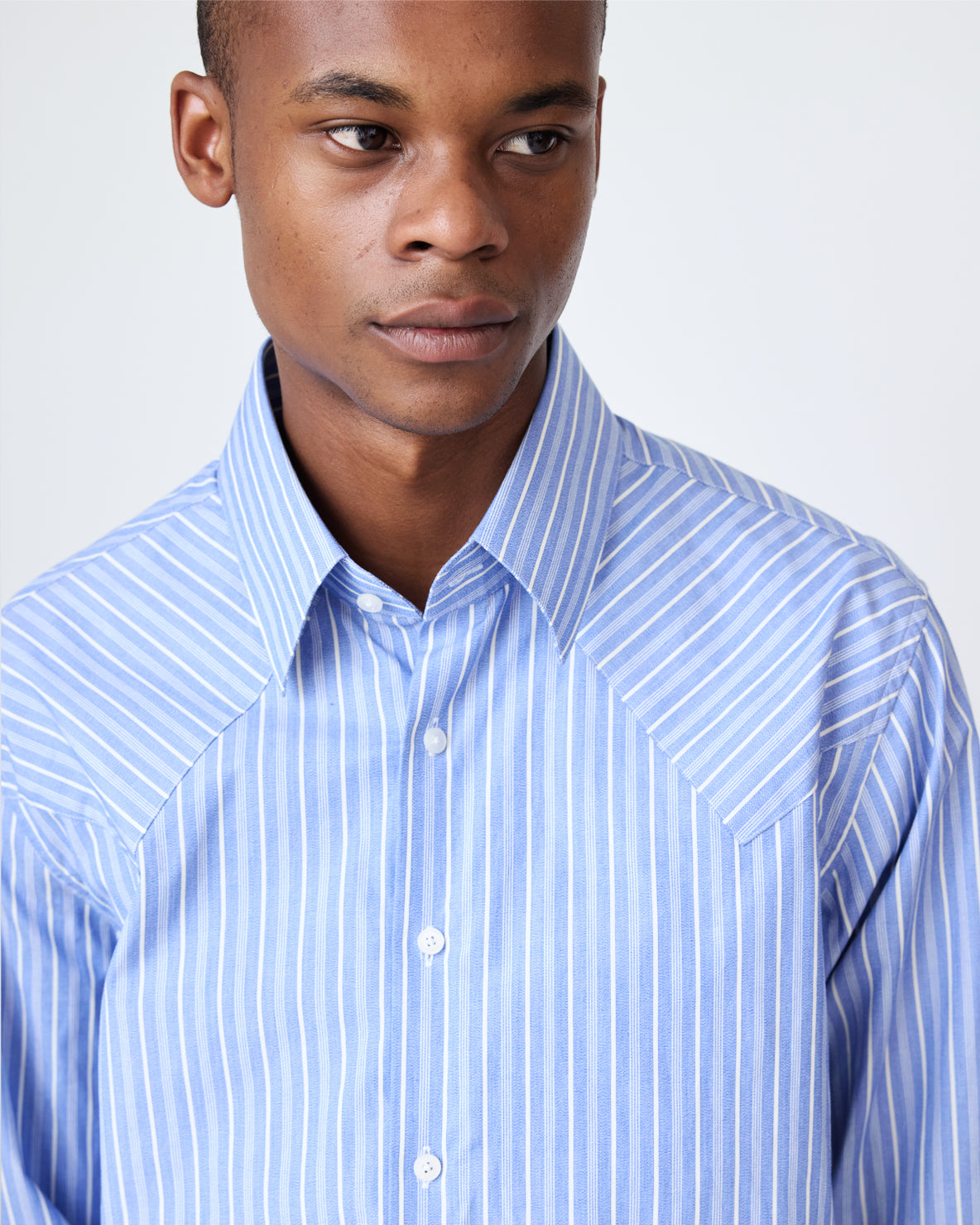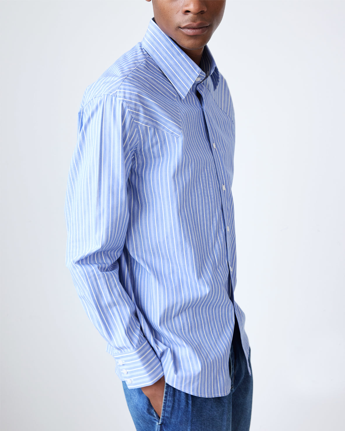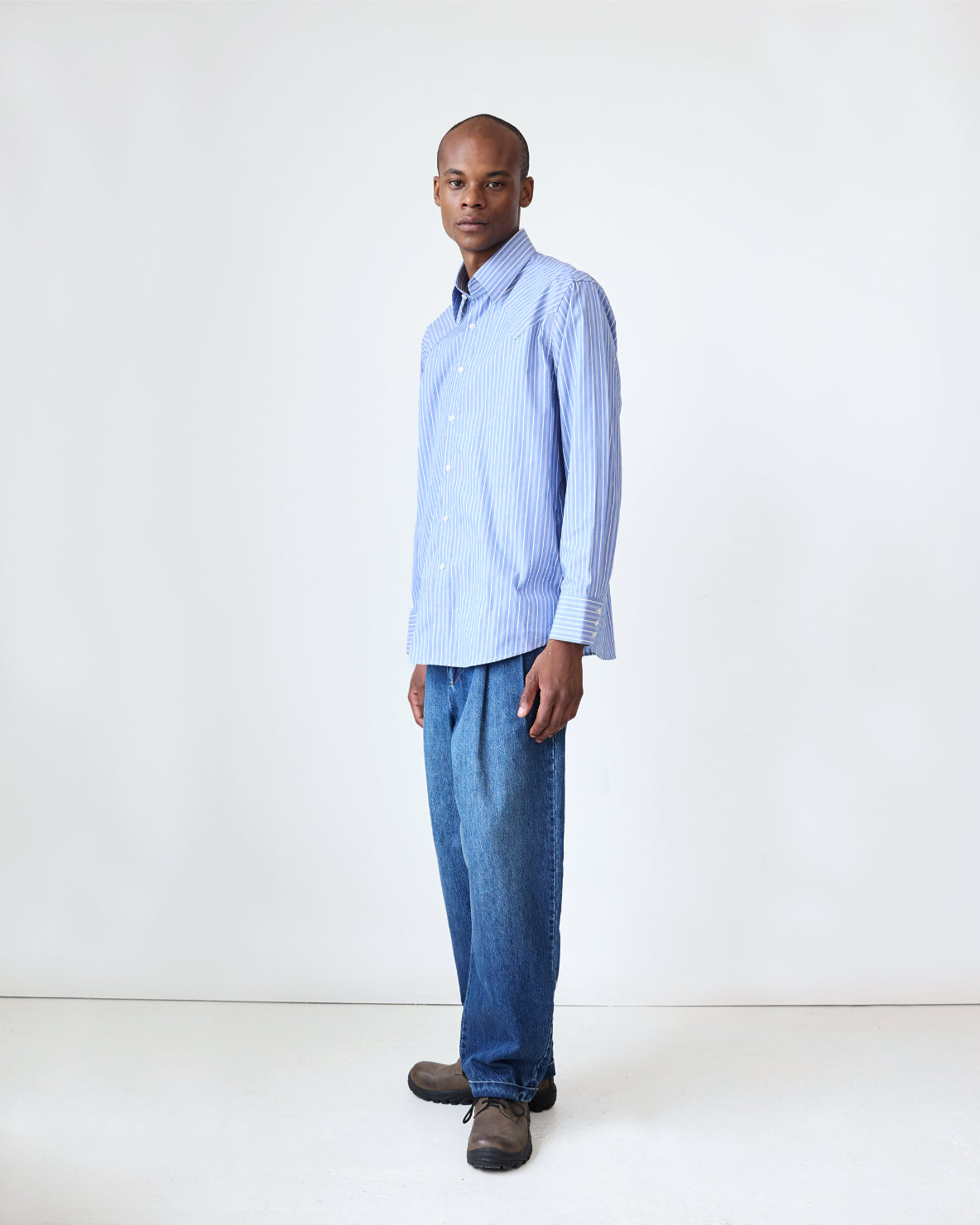 Our relaxed-fit western shirt returns in a crisp, deadstock cotton shirting. Featuring pared down western details like a contrast panelled yoke and triple button cuffs. This shirt has a roomy fit.